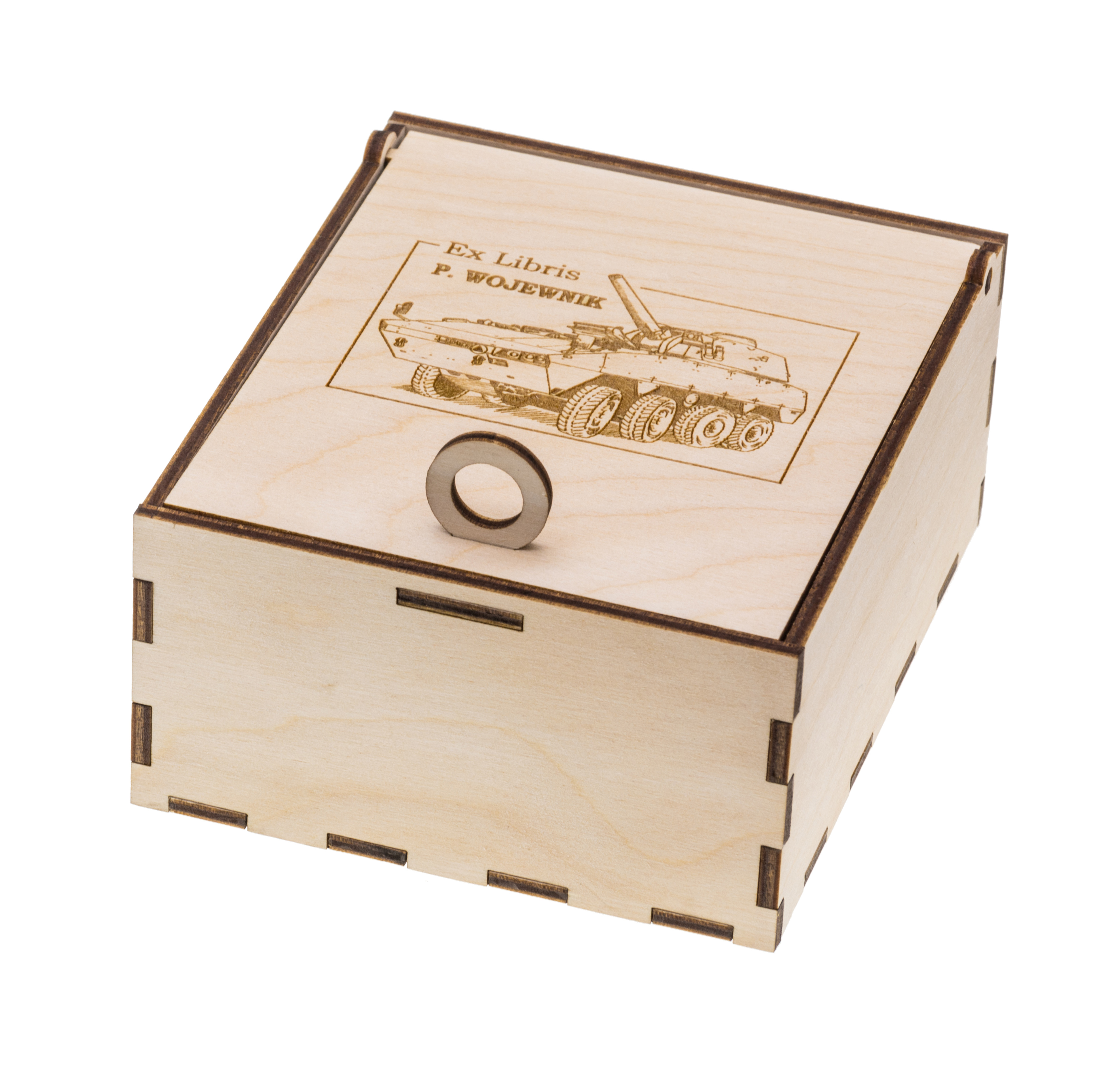 Wykonane jest z wysokiej jakości sklejki, precyzyjnie ciętej przy użyciu lasera. Ścianki łączone są bez użycia kleju, co zapewnia solidną konstrukcję. Wewnątrz pudełka znajduje się poduszka, dostosowana kształtem i wielkością do wybranego przez Państwa Ex Librisa, a na wierzchu znajduje się grawer przedstawiający odbicie tej właśnie pieczątki.